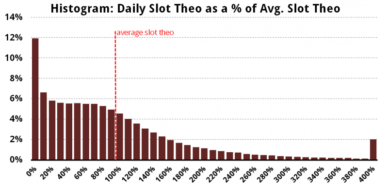 In Part 1, we introduced the skewed distribution of daily theo results, showing that players played well below their average on most days, offset by a handful of days significantly above their average — perhaps 2x, 5x or more. Here’s what that histogram looks like (note: the right-most bar at 400% actually combines all results above 4x average):