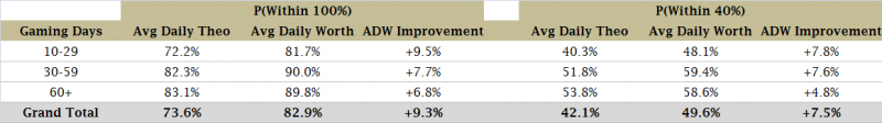 A few readers may be thinking, “my casino uses ADW (Average Daily Worth), we combine both Theo and Actual into a single calculation, that should solve this issue!” Except it really doesn’t. Yes, ADW is closer to Actual than pure Average Daily Theo, but only by a little. In the table below, you can see that ADW is more likely than ADT to be within range of Actual, but the improvement is not that much.